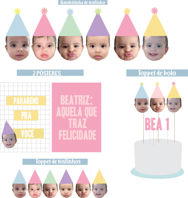 Personalizamos com fotos, paleta de cores, nome e idade do aniversariante.
