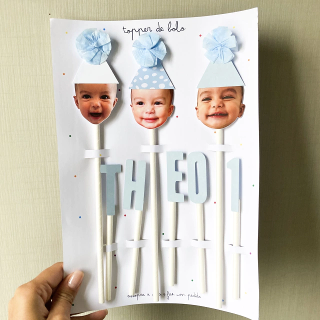 Topper de bolo com rostinhos, chapeuzinho e pompom de papel, com nome e idade. Personalizamos na paleta de cores que você nos enviar. A quantidade de fotos necessária será solicitada pela produção de acordo com o seu pedido.